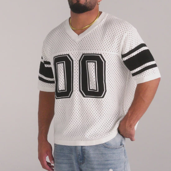 DISEÑO: El Varsity Knit Jersey presenta un look atlético y llamativo con un toque premium. Confeccionado en algodón transpirable con perforaciones tipo malla, este jersey combina la estética deportiva retro con una comodidad elevada. Con rayas clásicas, números varsity y un ajuste en talla estándar, está hecho para destacar.